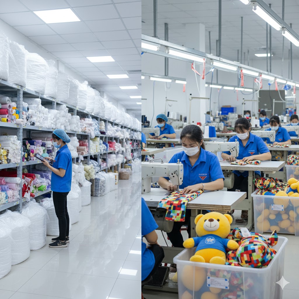 Lựa chọn Nguyên vật liệu: Sử dụng các loại vải, bông gòn, phụ kiện an toàn, có nguồn gốc rõ ràng và đạt chuẩn xuất khẩu.